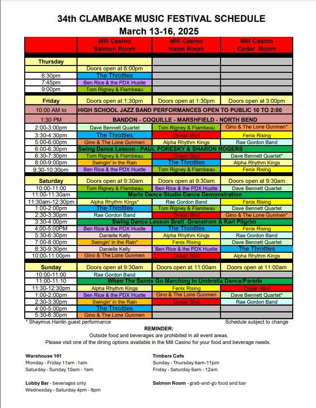 The day begins with special performances by local high school bands at the Mill Casino from 10:00 a.m. to 1:30 p.m., followed by featured bands performing in the Salmon Room, Hazel Room, and Cedar Room from 2:00 p.m. to 10:30 p.m., including the following acts:
