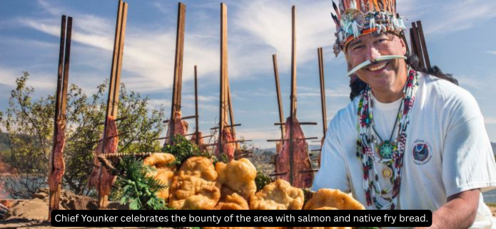 Chief Jason Younker, featured in the short video below about the origins of the Salmon Festival, is a University of Oregon faculty member who grew up along Coos Bay’s South Slough. He holds three graduate degrees, including a doctorate in cultural anthropology, and serves as chair of the board for Oregon’s Chemawa Indian School. He is also the past president of the Association of Indigenous Archaeologists. Since the Salmon Celebration was first opened to the public in 2005, Chief Younker has taken part as a cook in the traditional open-pit salmon bake—a role he learned by watching his father.