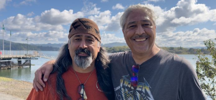 Chief Jason Younker pictured above with his brother, Shirod Younker, who oversees the canoe races during the annual Salmon Celebration. A well-known Pacific Northwest artist, Shirod has also designed the artwork featured on the event's T-shirts and posters for the past 20 years.