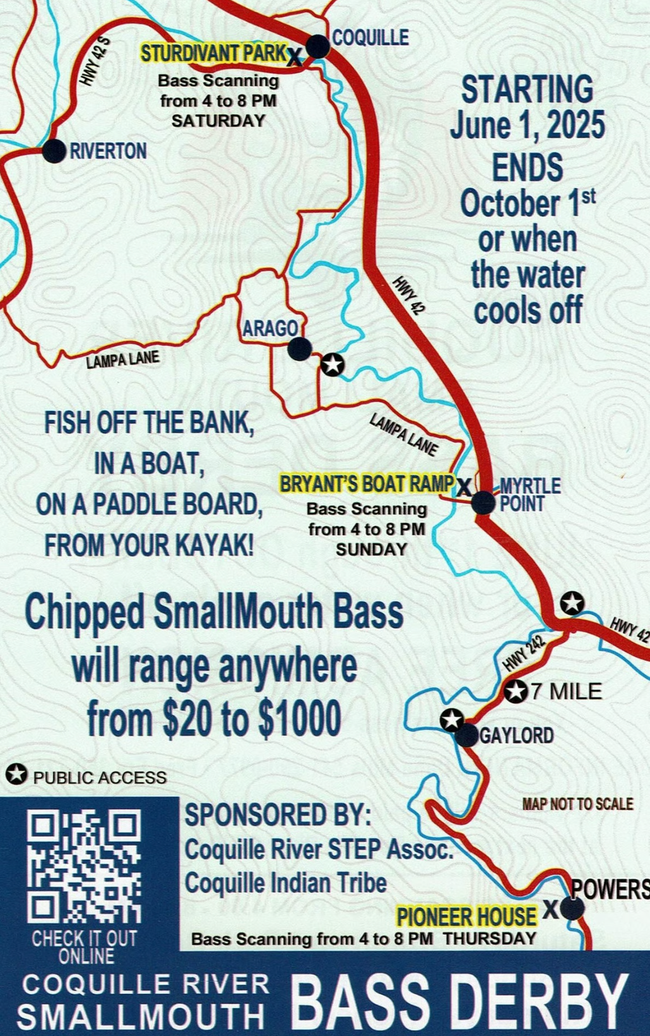 Just bring your catch to one of the scanning stations in Sturdivant Park,Bryant Boat Ramp, or the Pioneer House in Powers to see if your fish is a winner.