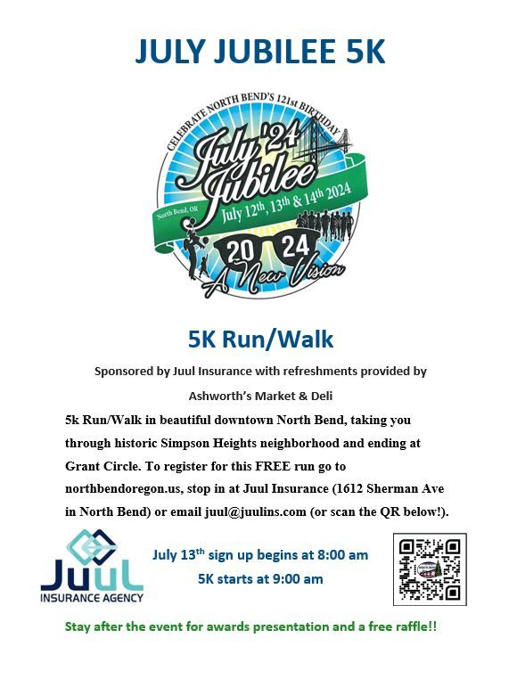 - July Jubilee Jaunt - July 13, 2024. Join Juul Insurance for the July Jubilee Jaunt, a 5K run/walk through beautiful historical downtown North Bend on July 13th. Registration for the event starts at 8:00 a.m. at the North Bend Boardwalk, with the run/walk kicking off at 9:00 a.m. Click here for route map. For more details, contact Winnie at (541) 756-4121 or juul@juulins.com.