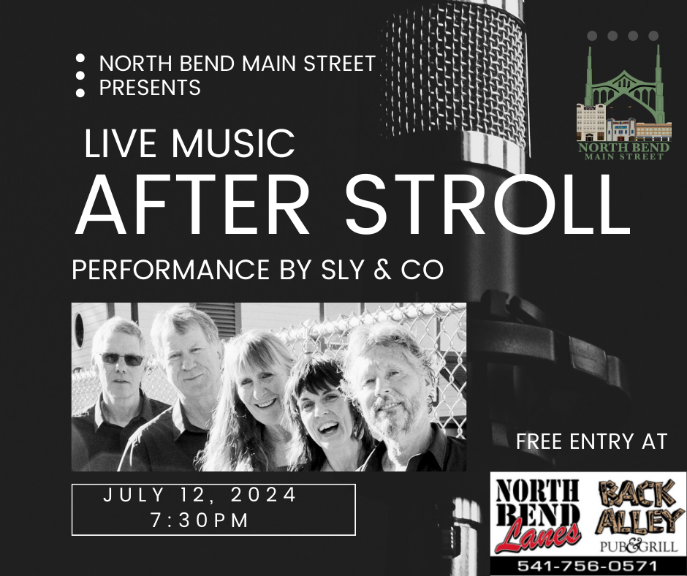 - Sip N Stroll - July 12, 2024. Join North Bend Main Street for their monthly Sip N Stroll on July 12th from 5:00 PM to 7:00 p.m. starting at the new North Bend Visitor Information Center at 745 California Ave. This event officially kicks off the 2024 July Jubilee celebration with birthday cake and honored citizen awards at 4:30 PM at Grants Circle, followed by live music from Sly & Co at the Back Alley starting at 7:30 PM. A $10 donation includes a glass and map for the Sip N Stroll portion of the evening. Learn more by visiting www.facebook.com/share/2oV9ZrGCrrQsu7NF.