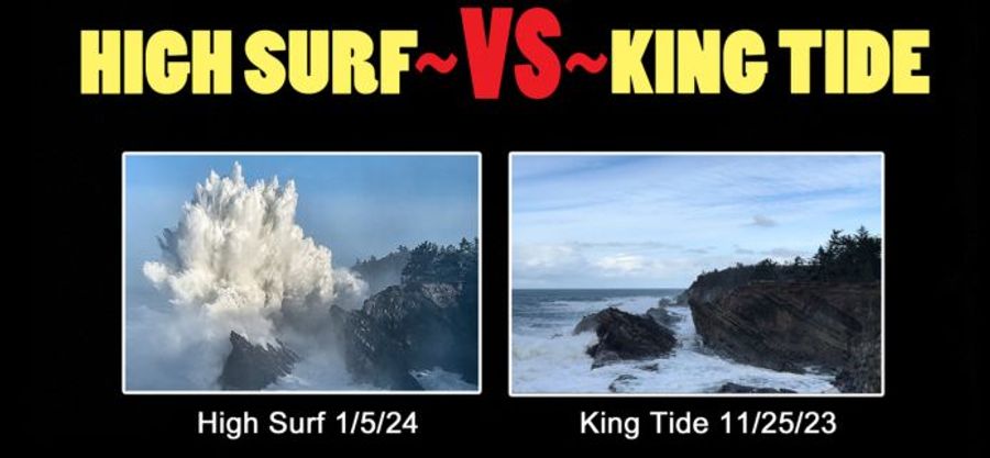 Do King Tides Cause High Surf Conditions? No. A King Tide without the High Surf is just a lot of water that is higher in the waterways of the area than a normal high tide. A High Surf can be combined with a King Tide but this happens on rare occasions. When such does happen, however, the wave action at Shore Acres State Park can be awe-inspiring and will bring photographers and visitors out in droves. We will post on our Facebook page anytime we have a High Surf Advisory or Warning. If they happen to coincide with a King Tide, we'll note that too!