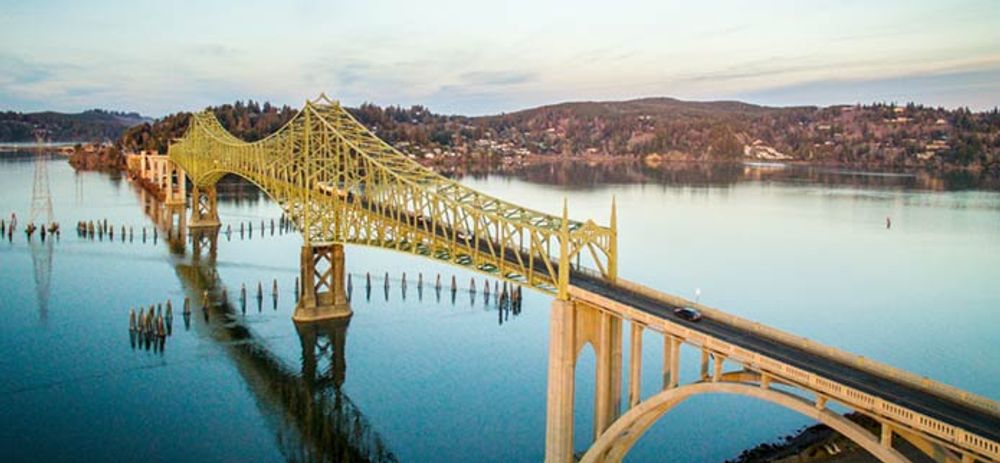 McCULLOUGH BRIDGE (1936) Last of five coast bridges to complete the Roosevelt Highway (US 101). It was a depression-era WPA project, costing more than $2,000,000, employed hundreds, has a length of 5,888 feet, a center height of 150 feet. Originally Coos Bay Bridge, it was renamed in 1947 for its designer Conde B. McCullough.